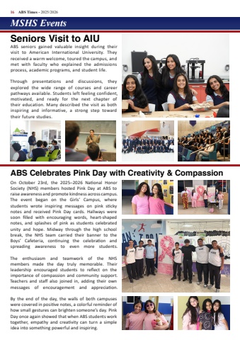 MSHS EventsABS seniors gained valuable insight during their visit to American International University. They received a warm welcome, toured the campus, and met with faculty who explained the admissions process, academic programs, and student life. Through presentations and discussions, they explored the wide range of courses and career pathways available. Students left feeling confident, motivated, and ready for the next chapter of their education. Many described the visit as both inspiring and informative, a strong step toward their future studies.Seniors Visit to AIUABS Celebrates Pink Day with Creativity & CompassionOn October 23rd, the 2025%u20132026 National Honor Society (NHS) members hosted Pink Day at ABS to raise awareness and promote kindness across campus.The event began on the Girls%u2019 Campus, where students wrote inspiring messages on pink sticky notes and received Pink Day cards. Hallways were soon filled with encouraging words, heart-shaped notes, and splashes of pink as students celebrated unity and hope. Midway through the high school break, the NHS team carried their banner to the Boys%u2019 Cafeteria, continuing the celebration and spreading awareness to even more students.The enthusiasm and teamwork of the NHS members made the day truly memorable. Their leadership encouraged students to reflect on the importance of compassion and community support. Teachers and staff also joined in, adding their own messages of encouragement and appreciation.By the end of the day, the walls of both campuses were covered in positive notes, a colorful reminder of how small gestures can brighten someone%u2019s day. Pink Day once again showed that when ABS students work together, empathy and creativity can turn a simple idea into something powerful and inspiring.16 ABS Times - 2025/2026