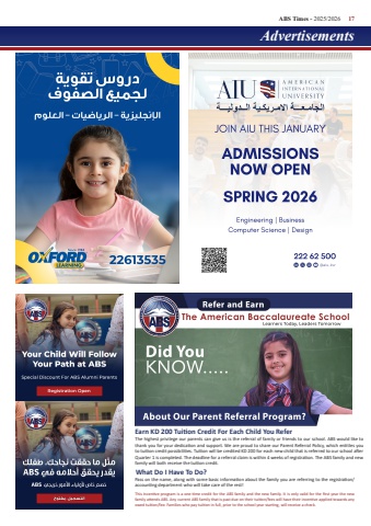 AdvertisementsEarn KD 200 Tuition Credit For Each Child You ReferWhat Do I Have To Do?The highest privilege our parents can give us is the referral of family or friends to our school. ABS would like to thank you for your dedication and support. We are proud to share our Parent Referral Policy, which entitles you to tuition credit possibilities. Tuition will be credited KD 200 for each new child that is referred to our school after Quarter 1 is completed. The deadline for a referral claim is within 4 weeks of registration. The ABS family and new family will both receive the tuition credit.Pass on the name, along with some basic information about the family you are referring to the registration/accounting department who will take care of the rest!This incentive program is a one-time credit for the ABS family and the new family. It is only valid for the first year the new family attends ABS. Any current ABS family that is past due on their tuition/fees will have their incentive applied towards any owed tuition/fee. Families who pay tuition in full, prior to the school year starting, will receive a check.ABS Times - 2025/2026 17
