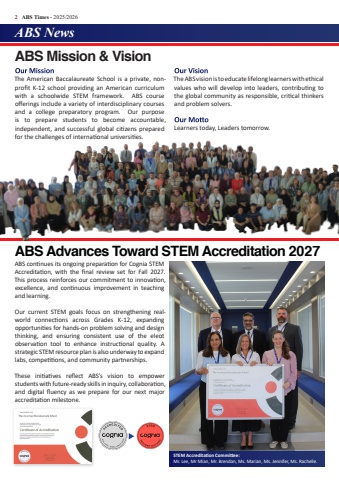 ABS News2 ABS Times - 2025/2026ABS Mission & VisionABS Advances Toward STEM Accreditation 2027ABS continues its ongoing preparation for Cognia STEM Accreditation, with the final review set for Fall 2027. This process reinforces our commitment to innovation, excellence, and continuous improvement in teaching and learning.Our current STEM goals focus on strengthening realworld connections across Grades K-12, expanding opportunities for hands-on problem solving and design thinking, and ensuring consistent use of the eleot observation tool to enhance instructional quality. A strategic STEM resource plan is also underway to expand labs, competitions, and community partnerships.These initiatives reflect ABS%u2019s vision to empower students with future-ready skills in inquiry, collaboration, and digital fluency as we prepare for our next major accreditation milestone.Our MissionThe American Baccalaureate School is a private, nonprofit K-12 school providing an American curriculum with a schoolwide STEM framework. ABS course offerings include a variety of interdisciplinary courses and a college preparatory program. Our purpose is to prepare students to become accountable, independent, and successful global citizens prepared for the challenges of international universities.STEM Accreditation Committee:Mr. Lee, Mr Mian, Mr. Brendan, Ms. Marian, Ms. Jennifer, Ms. Rachelle.Our VisionThe ABS vision is to educate lifelong learners with ethical values who will develop into leaders, contributing to the global community as responsible, critical thinkers and problem solvers.Our MottoLearners today, Leaders tomorrow.