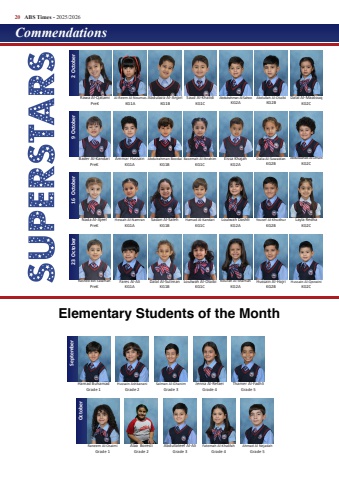 20 ABS Times - 2025/2026CommendationsRaneem Al-OsaimiGrade 1Alaa BoresliGrade 2Abdullateef Al-AliGrade 3Fatemah Al-KhalifahGrade 4Ahmad Al NejadahGrade 5Rawa Al-QatamiPreKBader Al-KandariPreKNada Al-Ajeel PreKRashed Bin SalamahPreKAl-Reem Al-NoumasKG1AAmmar HussainKG1AHessah Al-NamranKG1AFares Al-AliKG1AAbdulaziz Al-Anjari KG1BAbdulrahman BoodaiKG1BSadan Al-Saleh KG1BDalal Al-Suliman KG1BSaud Al-KhalidiKG1CBasemah Al-IbrahimKG1CHamad Al-KandariKG1CLoulwah Al-Otaibi KG1CAbdulrahman Al-SahooKG2AEissa KhajahKG2ALoulwah DashtiKG2ANourah Al-Sharhan KG2AAbdullah Al-Otaibi KG2BDalia Al-Suwaidan KG2BYousef Al-KhudhurKG2BHussain Al-Hajri KG2BDalal Al-Maatouq KG2CAbdulwahab Al-Omani KG2CLayla Redha KG2CHussain Al-QezwiniKG2CHussain AshkananiGrade 2Salman Al-GhanimGrade 3Jenna Al-RefaeiGrade 4Thamer Al-FadhliGrade 5Hamad Buhamad Grade 12 October SeptemberOctober9 October 16 October 23 OctoberElementary Students of the Month