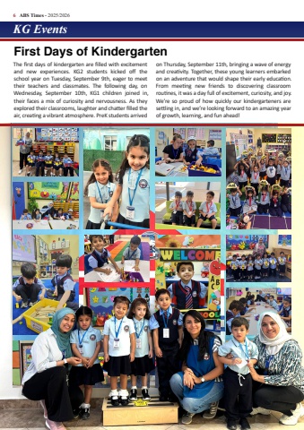 KG Events6 ABS Times - 2025/2026The first days of kindergarten are filled with excitement and new experiences. KG2 students kicked off the school year on Tuesday, September 9th, eager to meet their teachers and classmates. The following day, on Wednesday, September 10th, KG1 children joined in, their faces a mix of curiosity and nervousness. As they explored their classrooms, laughter and chatter filled the air, creating a vibrant atmosphere. PreK students arrived First Days of Kindergartenon Thursday, September 11th, bringing a wave of energy and creativity. Together, these young learners embarked on an adventure that would shape their early education. From meeting new friends to discovering classroom routines, it was a day full of excitement, curiosity, and joy. We%u2019re so proud of how quickly our kindergarteners are settling in, and we%u2019re looking forward to an amazing year of growth, learning, and fun ahead!