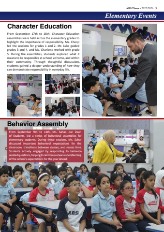 ABS Times - 2025/2026 9Elementary EventsCharacter Education From September 17th to 18th, Character Education assemblies were held across the elementary grades to highlight the importance of responsibility. Ms. Cheryl led the sessions for grades 1 and 2, Mr. Luke guided grades 3 and 4, and Ms. Charlotte worked with grade 5. During the assemblies, students explored what it means to be responsible at school, at home, and within their community. Through thoughtful discussions, students gained a deeper understanding of how they can demonstrate responsibility in everyday life.From September 9th to 11th, Ms. Sahar, our Dean of Students, led a series of behavioral assemblies for elementary students. During these sessions, Ms. Sahar discussed important behavioral expectations for the classroom, transitions between classes, and recess time. Students actively engaged by responding to behaviorrelated questions, helping to reinforce a clear understanding of the school%u2019s expectations for the year ahead.Behavior Assembly
