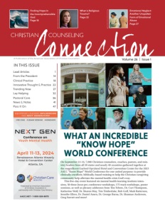 Christian Counseling Connection 3 The AACC also gave awards recognizing the following mental health professionals and coaches for their dedication to Christian counseling and coaching. The recipients included: n Paris Finner-Williams Award for Excellence in the Advancement of Cultural Sensitivity and Competence: D. Fredrica BrooksDavis, Psy.D. n James Dobson Award for Excellence in Marriage and Family Research and Advocacy: David Carder, M.A. n AACC Caregiver Awards for Excellence in Christian Caregiving: Gregory L. Jantz, Ph.D., Elias Moitinho, Ph.D., Sharon May, Ph.D., Gary Oliver, Th.M., Ph.D. n Gary Collins Award for Excellence in Research and Scholarship in Christian Counseling: William Hathaway, Ph.D. n President’s Award for Outstanding Influence and Leadership in the Development and Advancement of Christian Counseling Around the World: Daniel Amen, M.D. n James E. Clinton Award for Excellence in Pastoral Care and Ministry: Tim Timberlake n Frank Minirth Award for Excellence in Christian Psychiatry and Behavioral Medicine: Warren Kinghorn, M.D. n Mark Laaser Award for Excellence in Scholarship, Research, and Practice in the Study of Pornography, Sex Addiction, and Healing: Troy Haas, M.Div. n David Stoop Award for Excellence in Scholarship in Family Therapy and Practice: Greg Smalley, M.A., Psy.D. n Larry Crabb Award for Spiritual Formation, Soul Care, and Mental Health: Ian Jones, Ph.D., Ph.D. n Archibald D. Hart Christian Counseling Pioneer Award for Excellence in Research and Scholarship in Training and Educating the Next Generation of Leaders in Mental Health and Caring for Others: Chris Adams, Ph.D., Sylvia Hart Frejd, D.Min., Catherine Hart Weber, Ph.D. n ICCA Coach of the Year Award: Georgia Shaffer, M.A. n Michael Lyles Award for Excellence in Clinical Practice: Gary Sibcy, Ph.D. The “Know Hope” Exhibit Hall featured some of the world’s leading publishers, treatment centers, clinics, colleges, universities, resources, and ministries, all geared toward collaboration and resourcing the Christian counseling and coaching professionals in attendance. The revamped AACC Bookstore featured 20 new best-practice continuing education courses and other leading resources designed for professional development for every type of counselor, coach, and ministry leader. The World Conference also marked the official launch of AACC Publishing, which released four new workbooks and its first book, Bounce, authored by counselor, Donna Gibbs. “The Know Hope World Conference was one of the most, if not the most, spiritually-anchored, clinically-excellent, and meaningful events we have ever done,” said AACC President, Dr. Tim Clinton. He added, “From the praise and worship, professional workshops, and networking, people left rejoicing in God. Only heaven will tell of the influence from our time together. AACC’s exponential growth, development, and influence here and around the world is exploding. We look only to God for His continued direction into 2024 and beyond.” Save the date and do not miss your chance to attend the next AACC World Conference, “United,” in Nashville, Tennessee, at the Gaylord Opryland Hotel and Convention Center on September 23-27, 2025. ; LEAD ARTICLES “FROM THE PRAISE AND WORSHIP, PROFESSIONAL WORKSHOPS, AND NETWORKING, PEOPLE LEFT REJOICING IN GOD. ONLY HEAVEN WILL TELL OF THE INFLUENCE FROM OUR TIME TOGETHER. AACC’S EXPONENTIAL GROWTH, DEVELOPMENT, AND INFLUENCE HERE AND AROUND THE WORLD IS EXPLODING. WE LOOK ONLY TO GOD FOR HIS CONTINUED DIRECTION INTO 2024 AND BEYOND.” Dr. Tim Clinton