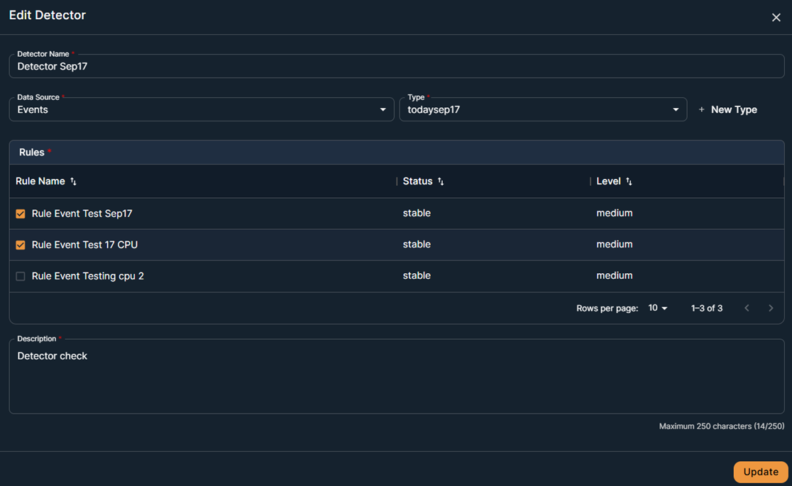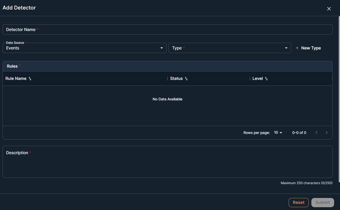 The Detector section is used to group one or more Detection Rules under a named detector. This detector acts as a correlation logic block and will be used to generate incidents/alerts.