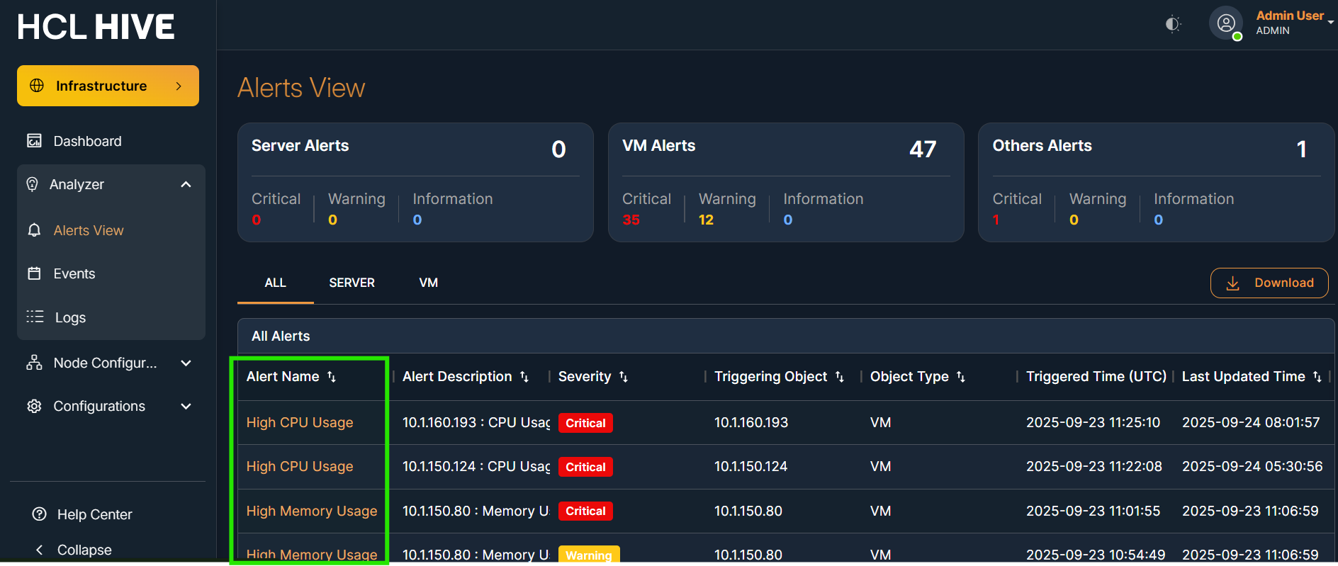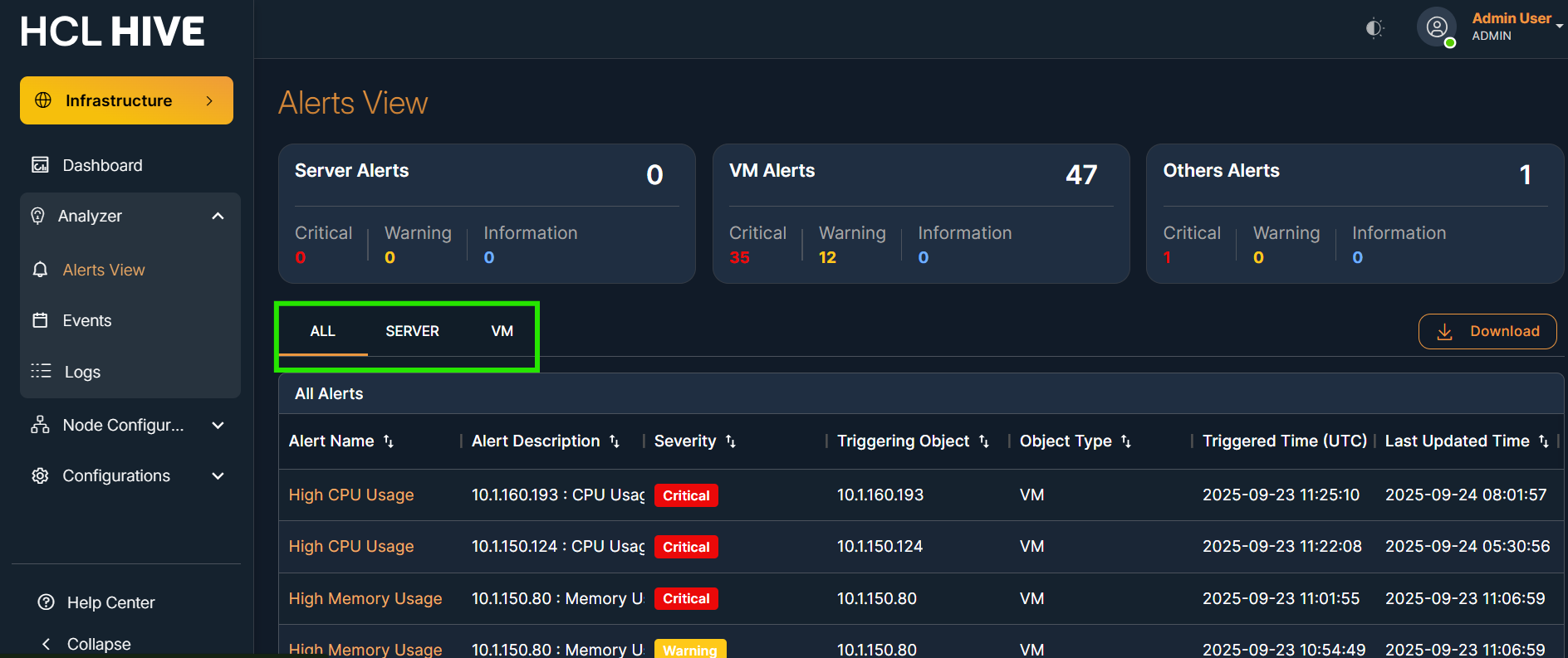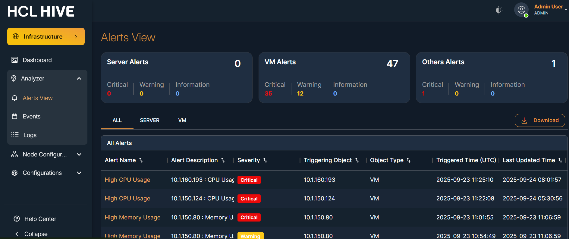 The Alerts View screen in the Hive platform displays real-time alerts that are generated based on threshold templates configured in the backend. These alerts are primarily triggered by monitoring tools like SNMP , OTEL Collector and reflect the health status of monitored virtual machines, servers, or applications.
