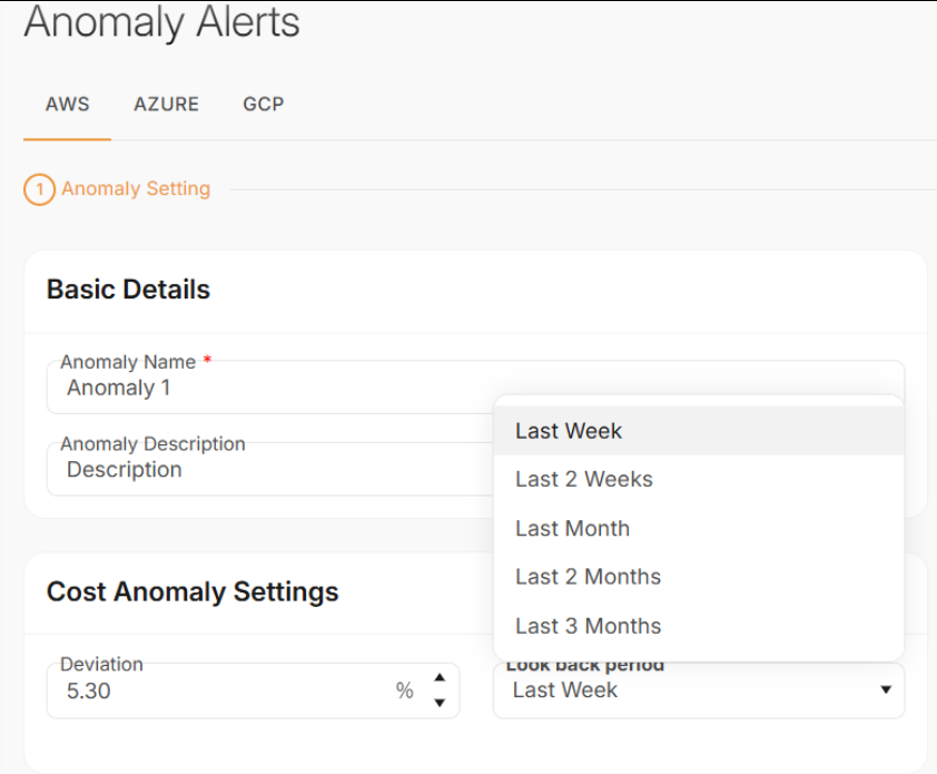 - Tabs are available for AWS, Azure, and GCP, enabling anomaly settings to be defined per cloud provider