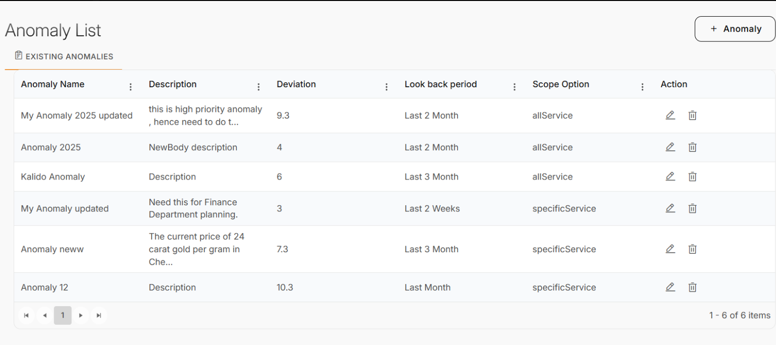 - Action – Options to edit or delete the anomaly configuration.