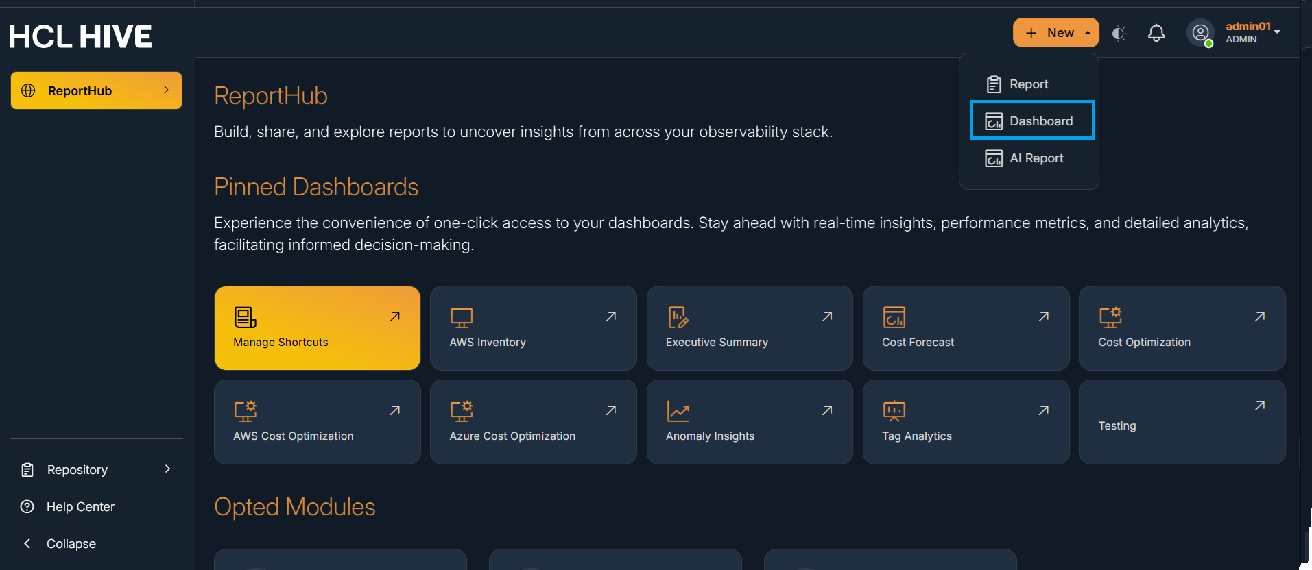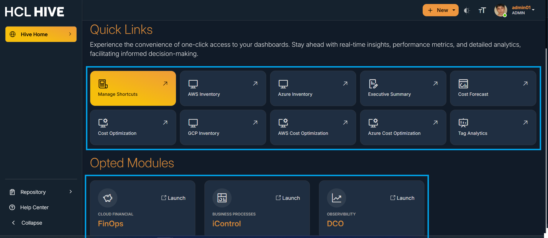Dashboards as “Quick Links” and to Domains as “Opted Modules” on the Homepage.