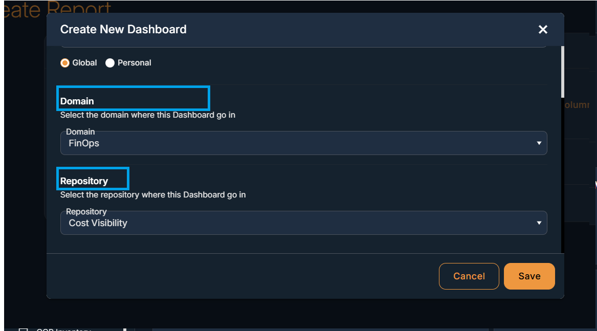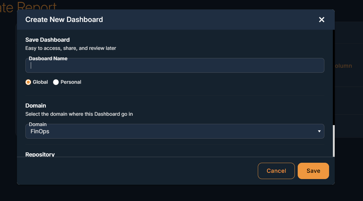 - The Dashboard template has one field "Dashboard name" and two dropdowns "Domain" and "Repository" to create a new dashboard . Users need to select these fields to create a dashboard.