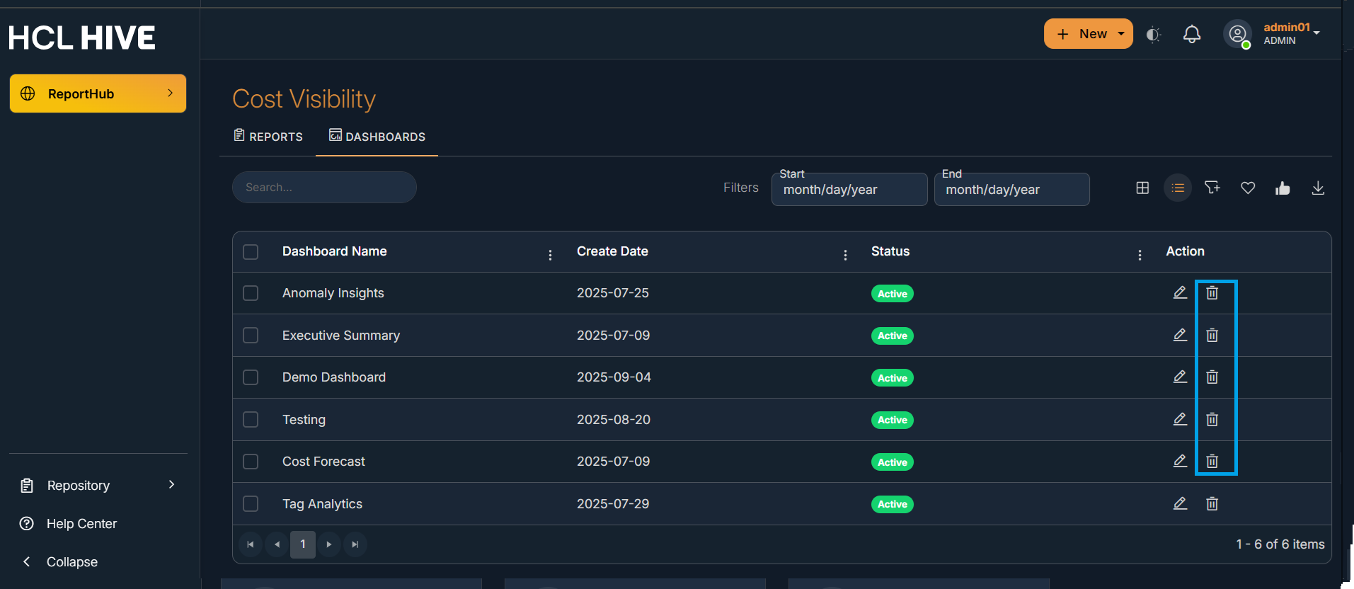 - Delete a Dashboard: The user needs to click on the delete icon present on the right