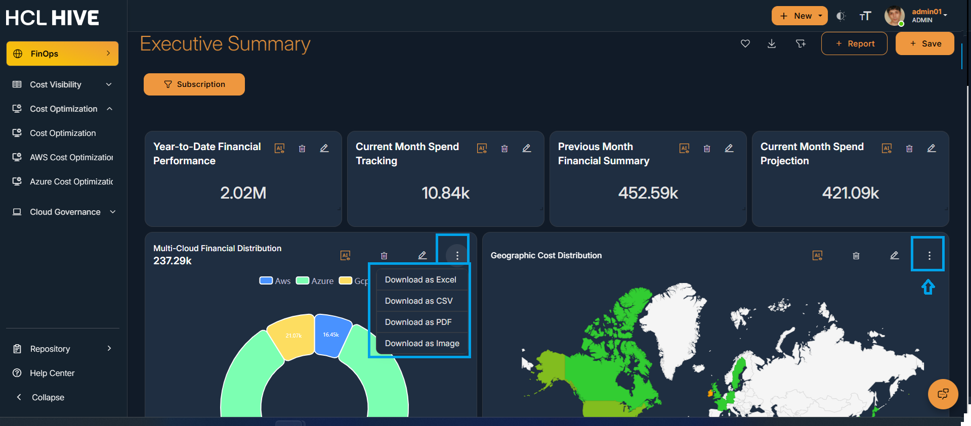 - Download dashboard (XLS, PDF, CSV, JPEG) : This feature helps the user to export the report i.e. customized or filtered snapshot of the data shown on the dashboard to your computer or cloud storage.