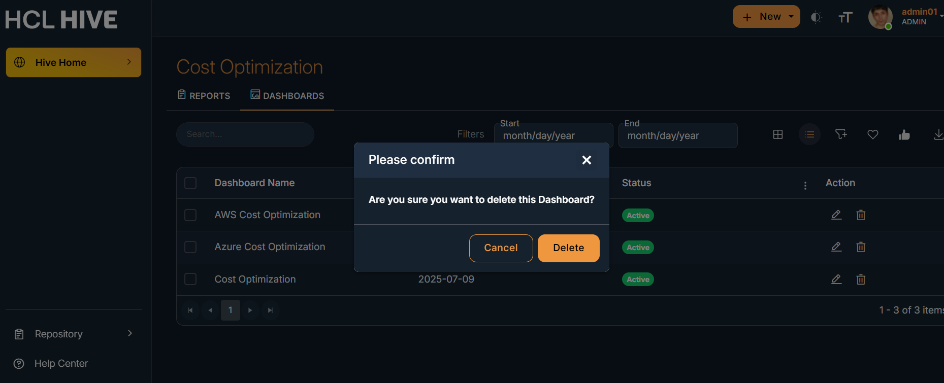 side , popup to either delete or cancel the dashboard appears. Click on the delete button to