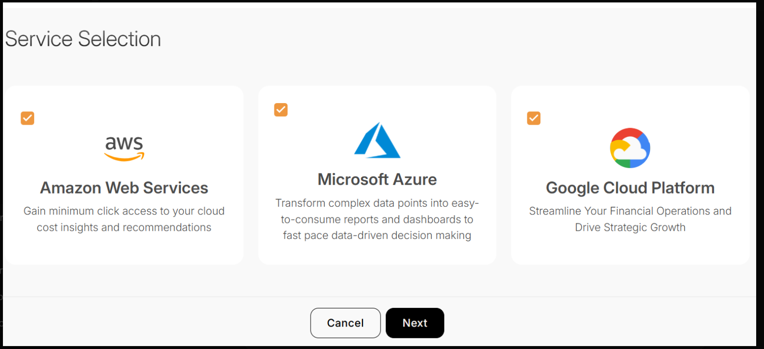 - Select the cloud provider you want to configure.On Service Selection, tick the providers you want to onboard: