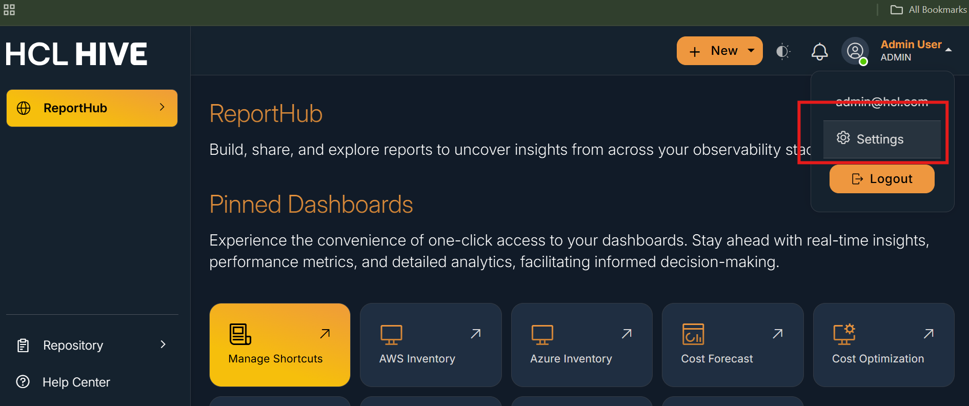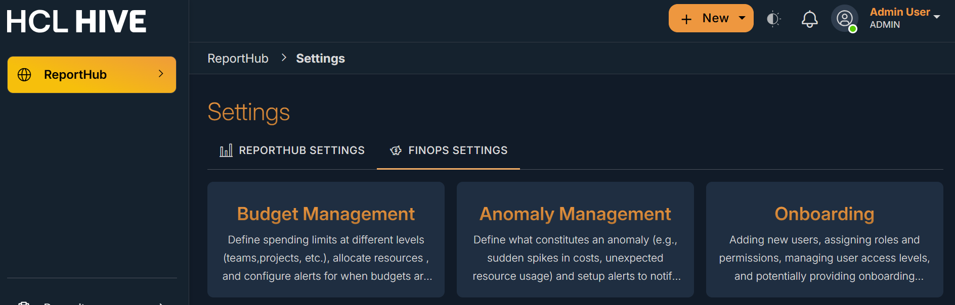 The FinOps Settings Page allows user to Onboard their cloud environment to the FinOps module set budgets and configure anomaly thresholds. To reach the FinOps Settings Page from the Hive Telco Observability home page, users can follow the below mentioned steps: