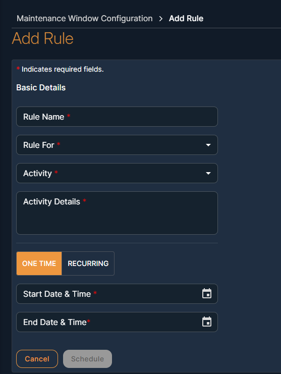 Schedule Type Description One Time In One Time Occurrence, the user sets the Start Date/Time and End Date/Time for the schedule. Recurring In Recurring Occurrence, the user sets the Start Date/Time and End Date/Time, and Selects to repeat the schedule daily, weekly, or monthly.