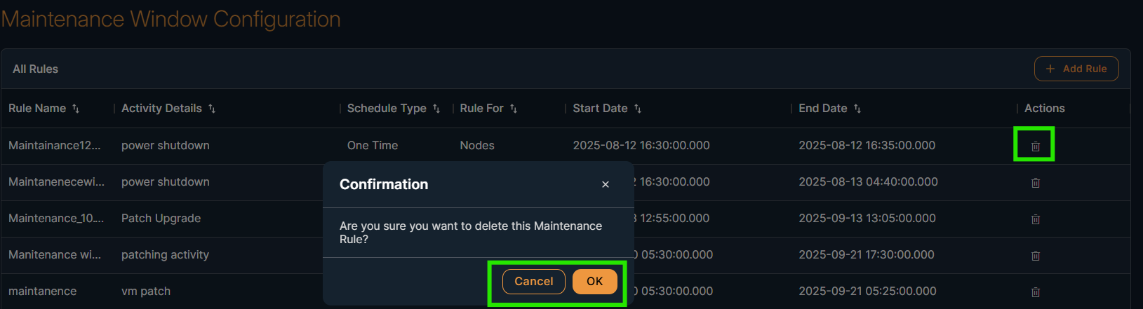 On the Maintenance Window Configuration screen , you can perform "Delete" operations