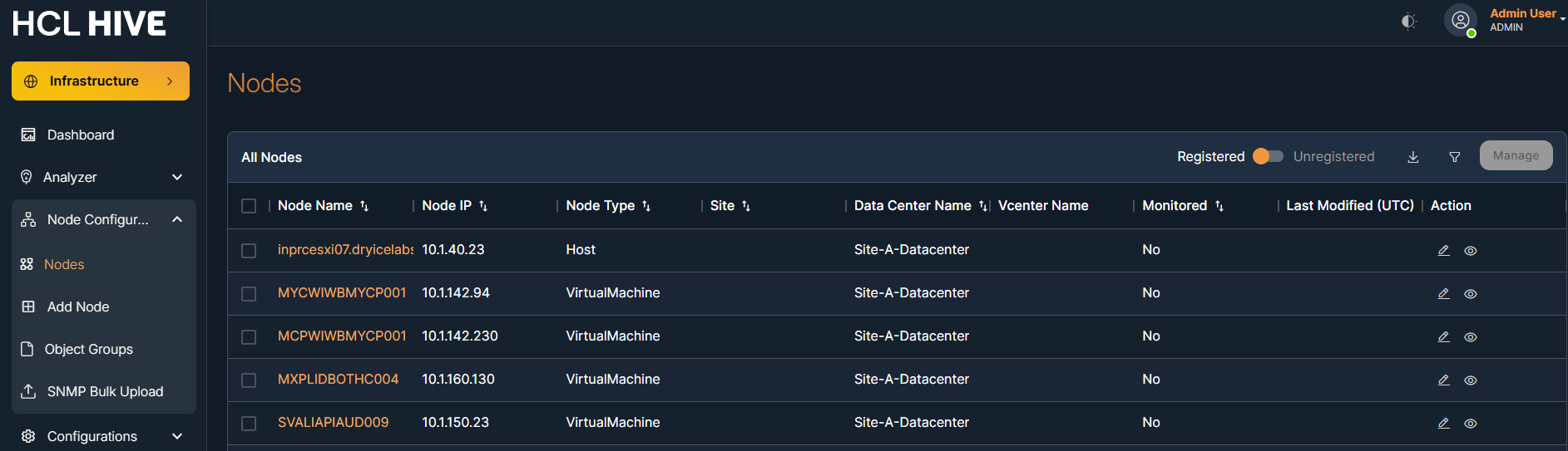Node Configuration allows administrators to onboard, configure, and monitor various nodes within the application. This section provides options to add new nodes, integrate with vCenter, and onboard nodes using SNMP. Proper configuration ensures that all nodes are monitored for performance and availability.