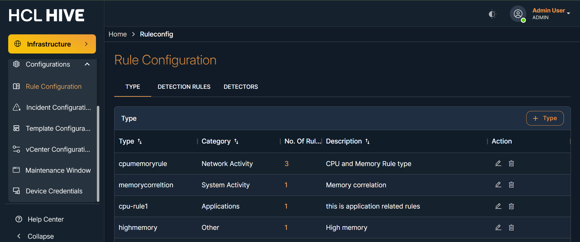 Rule configuration The Rule Configuration module in Hive allows users to define detection logic for identifying anomalous patterns in incoming telemetry/log data. This module consists of three features: Type Detection Rules Detectors Figure 1. Figure - Rule Configuration