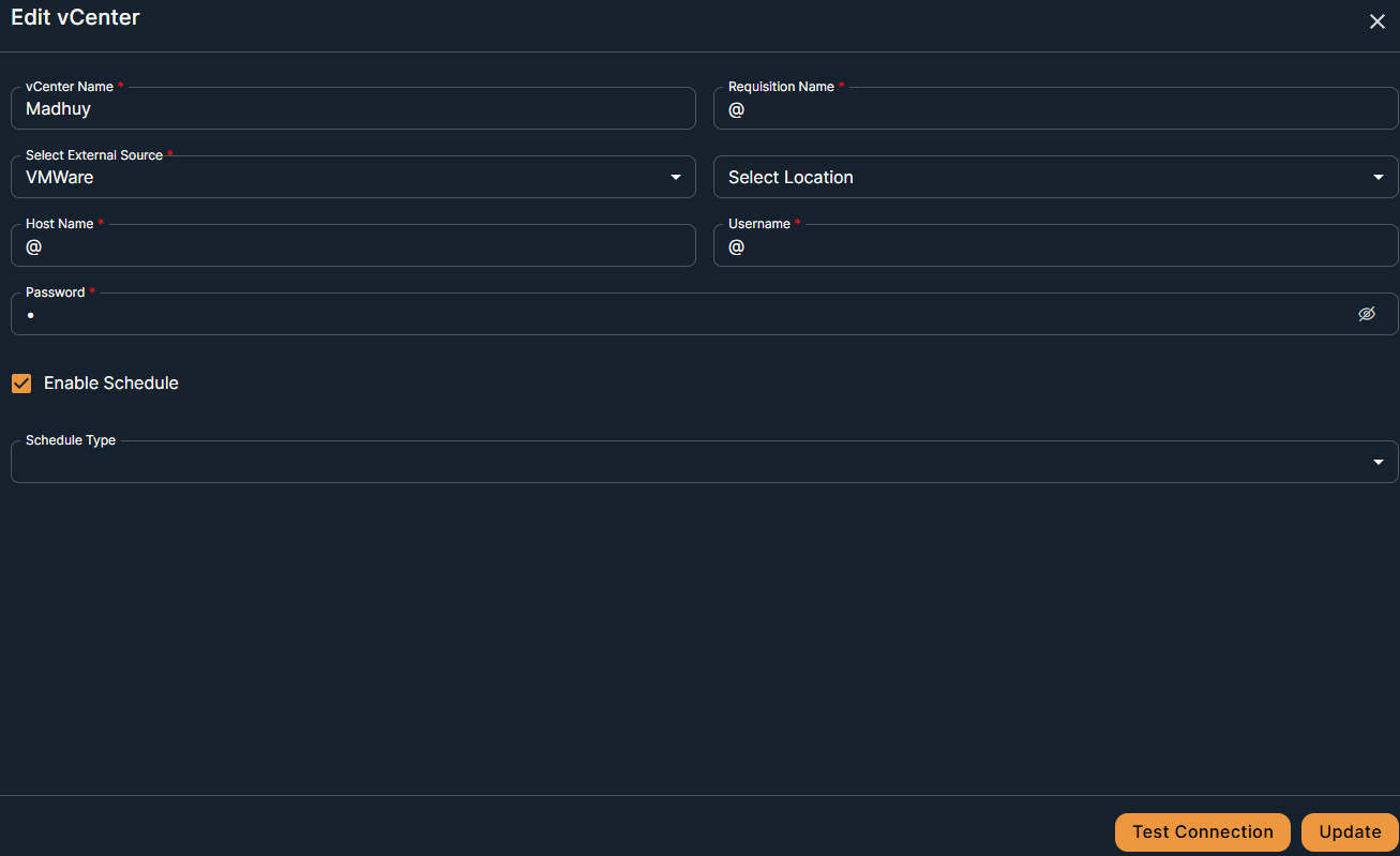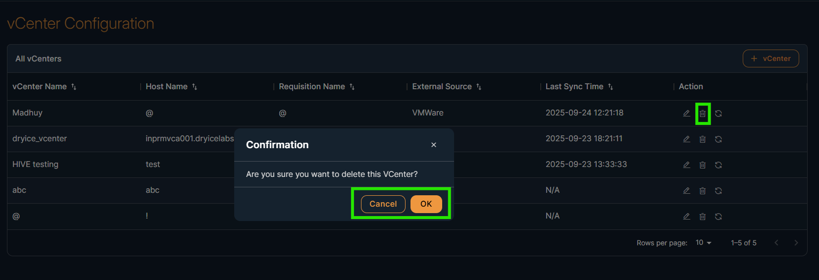 - To Edit, click the edit icon next to the vCenter entry, update the fields, and click Update.
