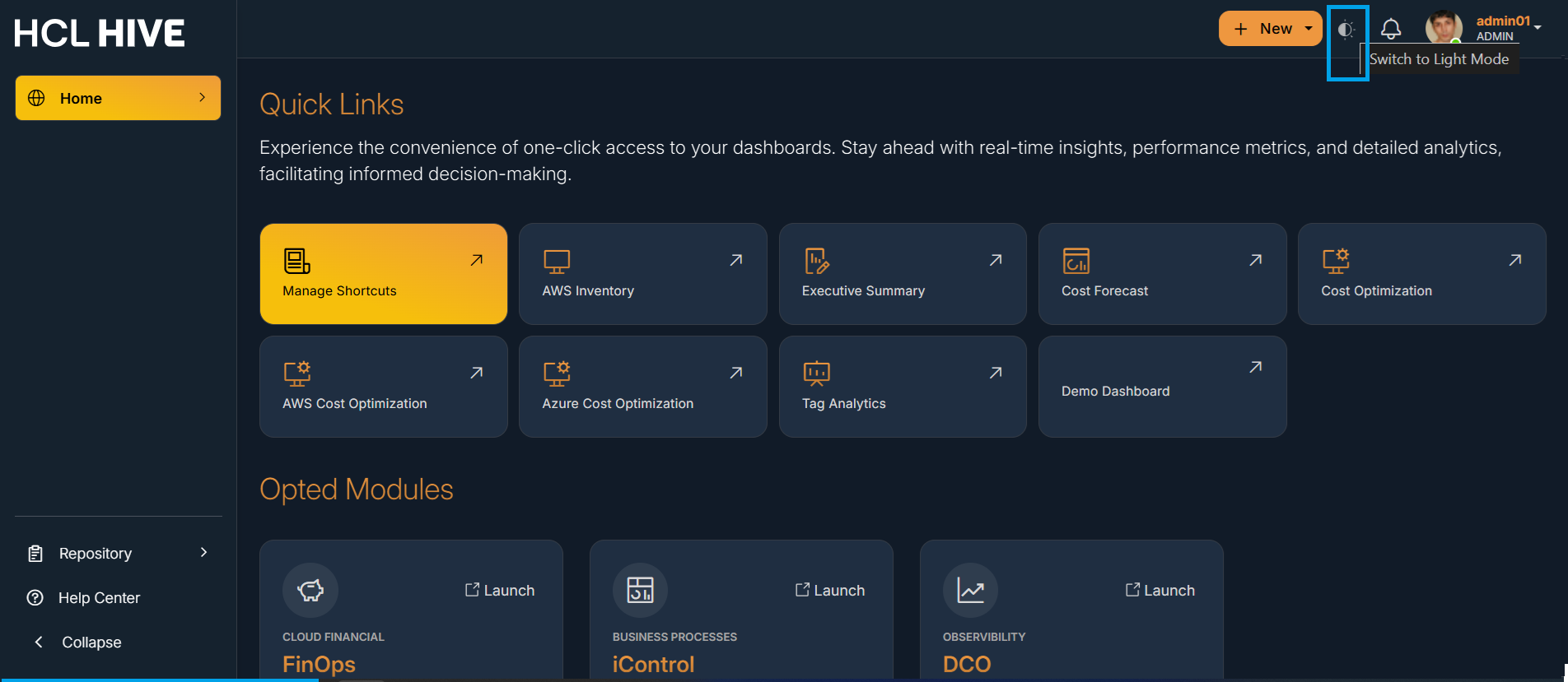 light modes to suit user preferences and working environments.Figure 1. Figure - Dark Mode and Icon to change the modeFigure 2. Figure - Light Mode
